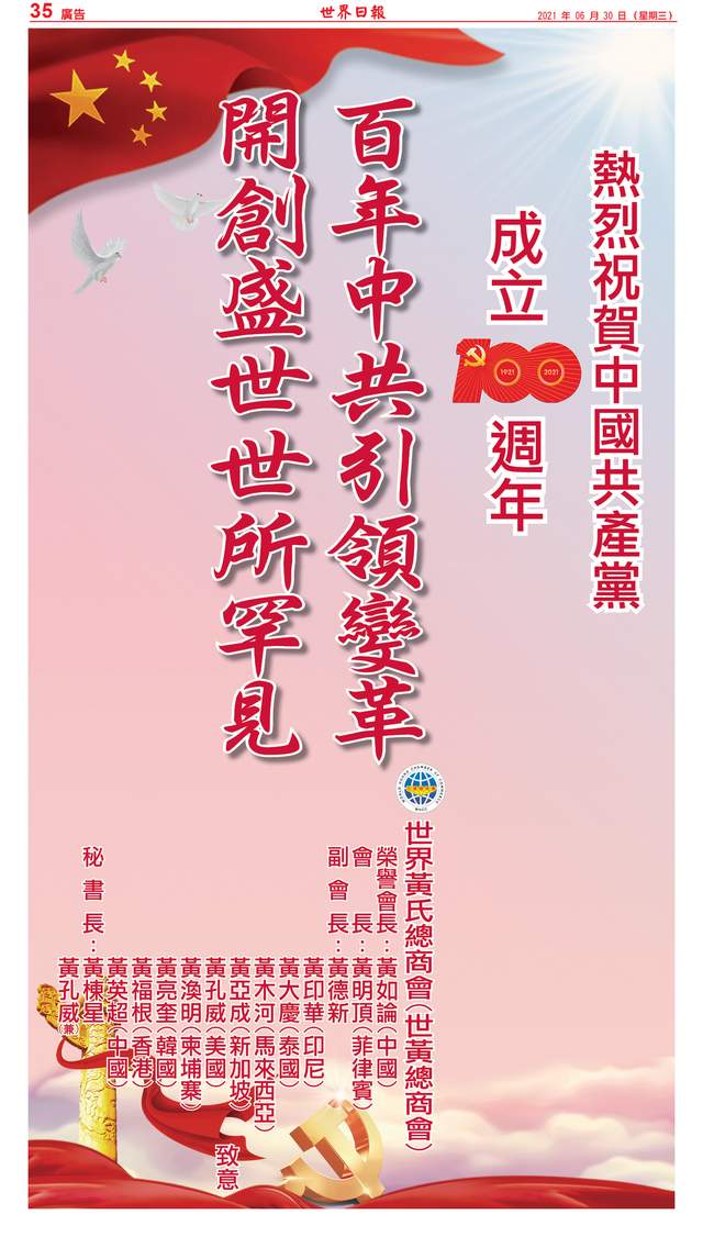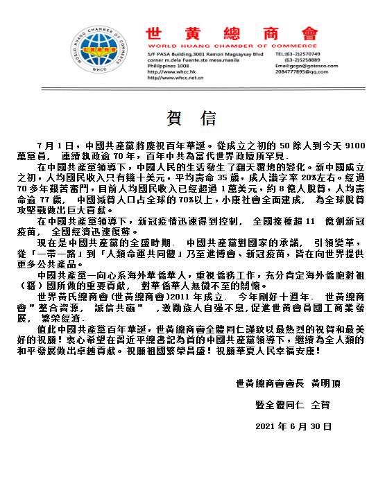 值此中國共產(chǎn)黨百年華誕,世黃總商會全體同仁謹致以最熱烈的祝賀和最美好的祝愿!衷心希望在習近平總書記為首的中國共產(chǎn)黨領導下,繼續(xù)為全人類的和平發(fā)展做出卓越貢獻。祝愿祖國繁榮昌盛!祝愿華夏人民幸福安康!