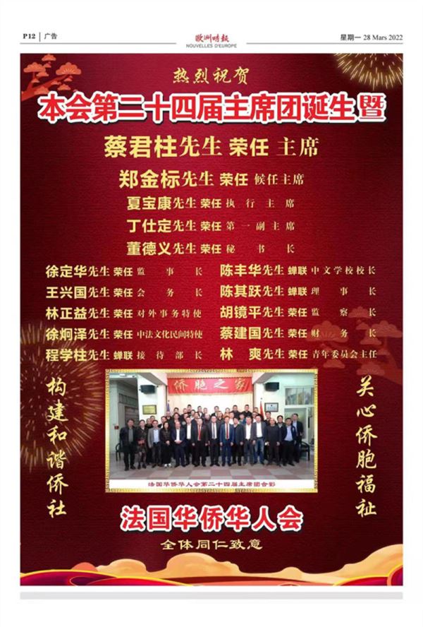 我們正處于戰(zhàn)爭下和新冠中,法國、歐洲的架構(gòu)有待重建,一切都是未知數(shù);中國的大國崛起成為當(dāng)今世界矚目的焦點(diǎn),我們法國華僑華人的精神面貌、經(jīng)濟(jì)生活也越來越引起法國主流社會的關(guān)注。如何加強(qiáng)融合、加快經(jīng)濟(jì)結(jié)構(gòu)轉(zhuǎn)型,更加正面地體現(xiàn)出華僑華人的形象、健康的經(jīng)濟(jì)模式以及生存方式,正是當(dāng)前法國華僑華人自身發(fā)展的重要目標(biāo)。在當(dāng)前形勢下,希望在座的各位一起攜手,扎根中華優(yōu)秀文化,打開全球經(jīng)濟(jì)視野;貫通東西智慧,融合旅法英才,共擔(dān)經(jīng)濟(jì)和文化的發(fā)展大任。最后,愿蔡主席和鄭主席繼續(xù)帶領(lǐng)法國華僑華人會以追求卓越的精神創(chuàng)造和睦相融、團(tuán)結(jié)友愛、充滿活力的法國華僑華人會!祝在座的各位:闔家幸福,事業(yè)蒸蒸日上!我們后會有期!