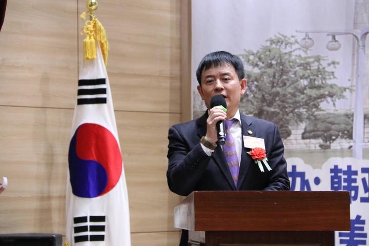 全國(guó)韓籍華人總聯(lián)合會(huì)總會(huì)長(zhǎng)、韓國(guó)新華報(bào)社社長(zhǎng)曹明權(quán)致大會(huì)開(kāi)幕詞。