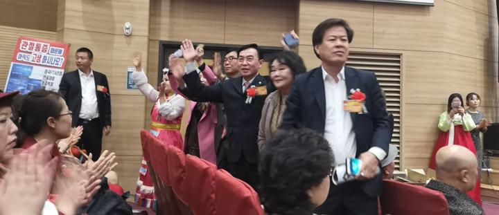 全國(guó)歸韓同胞總聯(lián)合會(huì)核心會(huì)長(zhǎng)團(tuán)成員入場(chǎng)受到與會(huì)代表的熱烈歡迎。