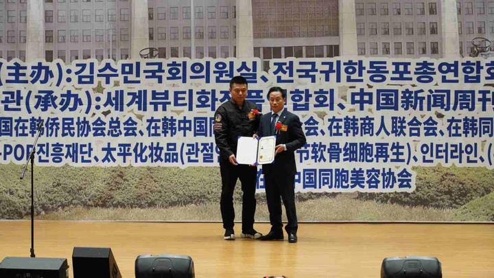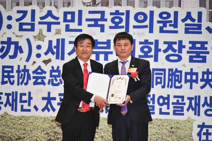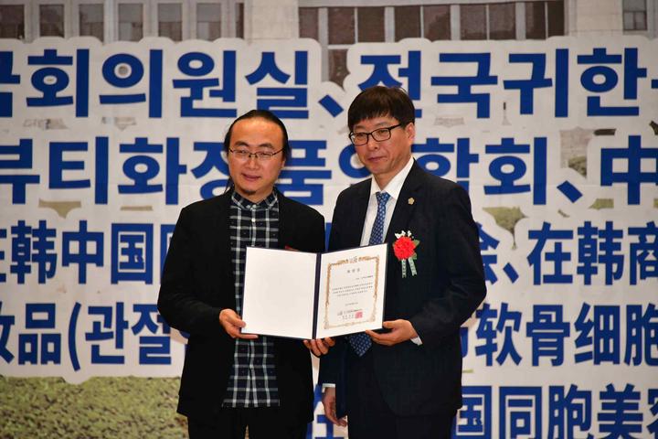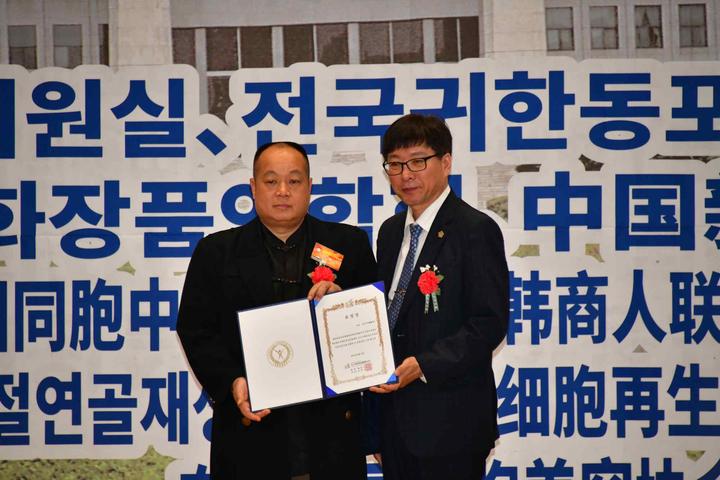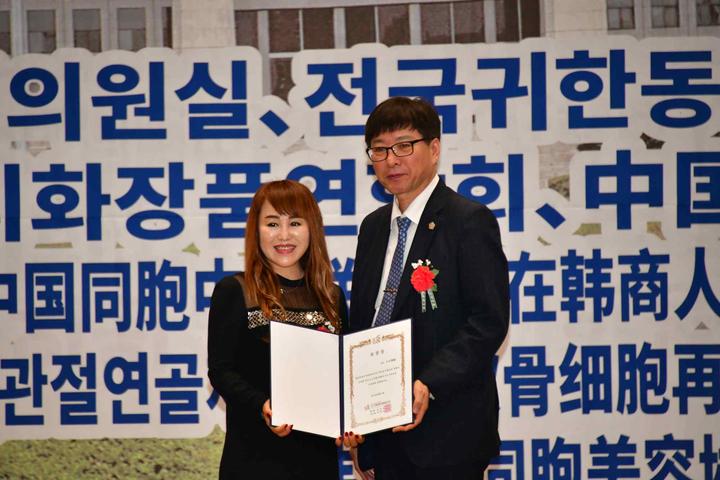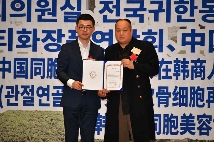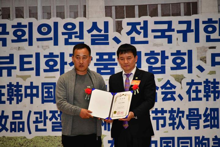 為表彰長(zhǎng)期以來(lái)為韓中兩國(guó)民間商貿(mào)往來(lái)中,做出突出貢獻(xiàn)的在韓中國(guó)同胞優(yōu)秀會(huì)員,韓國(guó)國(guó)會(huì)外交通商統(tǒng)一委員會(huì),特別為中國(guó)在韓僑民協(xié)會(huì)總會(huì)首席副總會(huì)長(zhǎng)嚴(yán)銀河(左)頒發(fā)表彰狀。