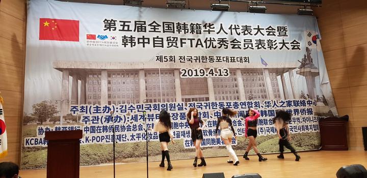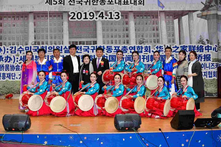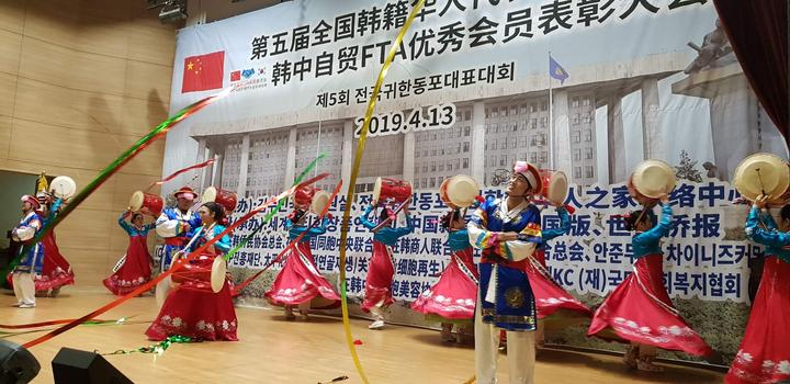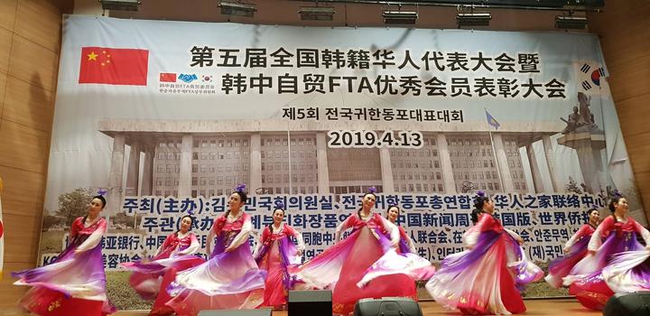 藝術(shù)團(tuán)演員們以歌舞的形式前來(lái)慶祝第五屆全國(guó)韓籍華人代表大會(huì)的順利召開(kāi)。
