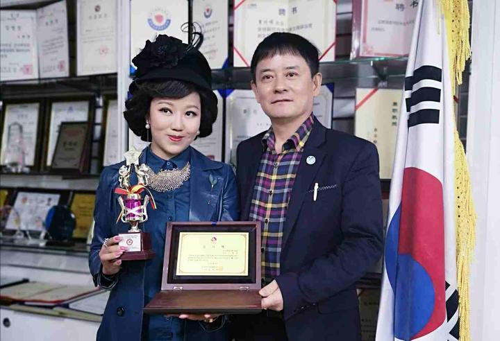 韓國(guó)歌手協(xié)會(huì)中央會(huì)常務(wù)副會(huì)長(zhǎng)曹明權(quán)(右)為當(dāng)天趕到大會(huì)現(xiàn)場(chǎng)獻(xiàn)唱中國(guó)歌曲的鄧麗君歌友會(huì)首席歌手、中國(guó)當(dāng)紅歌星韓小露(左)補(bǔ)發(fā)中韓國(guó)際藝術(shù)交流貢獻(xiàn)大獎(jiǎng)獎(jiǎng)牌。