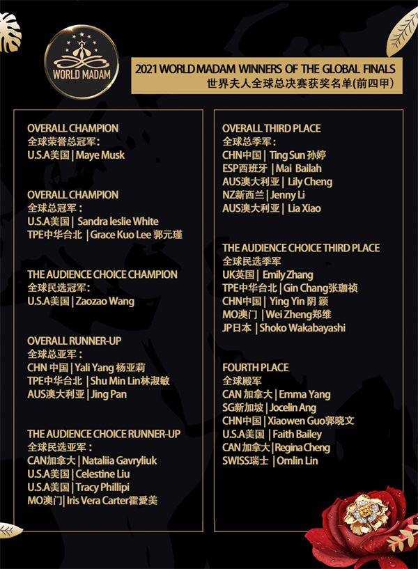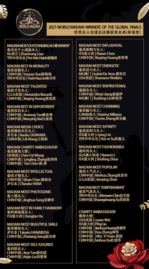 WORLD MADAM世界夫人2021全球總決賽獲獎名單: