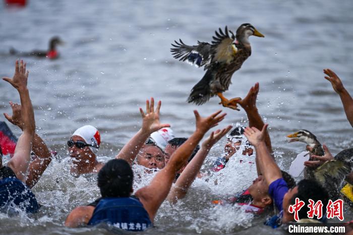 5月28日,四川夾江,游泳高手在青衣江上搶鴨子。當(dāng)日,2025年全國龍舟大聯(lián)動(dòng)暨“劃遍四川”樂山夾江站比賽拉開序幕,來自全國各地的24支龍舟代表隊(duì)在青衣江上飛槳逐浪、龍舟競渡迎端午。中新社記者 劉忠俊 攝