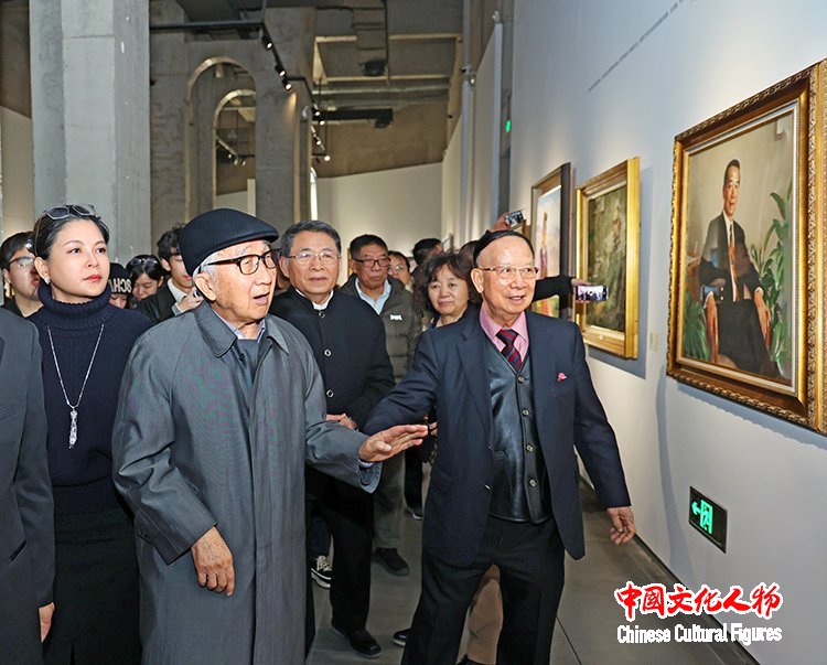 中央美術(shù)學(xué)院原院長(zhǎng)靳尚誼與港澳臺(tái)美協(xié)主席蔡豪杰等參觀展覽的藝術(shù)家嘉賓在展覽作品前交流