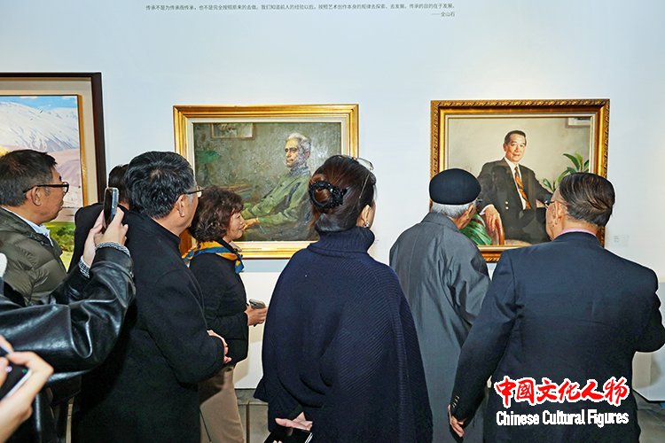 中央美術(shù)學(xué)院原院長(zhǎng)靳尚誼與參觀展覽的藝術(shù)家嘉賓在展覽作品前交流