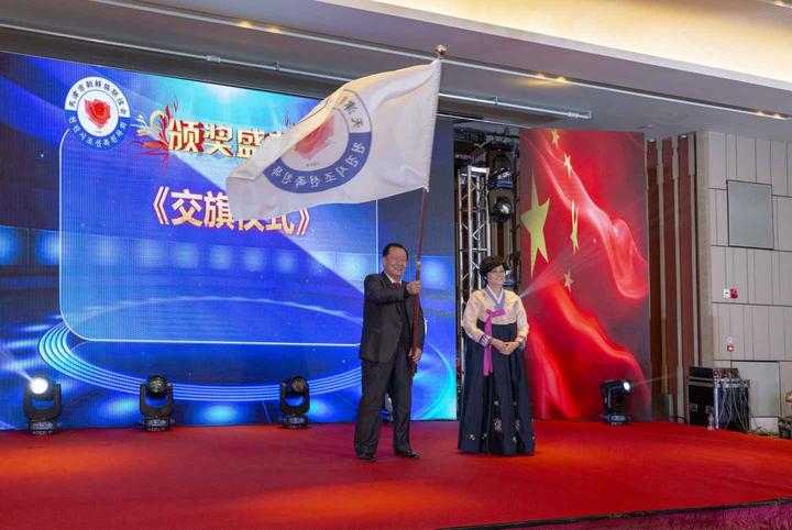 前任會長趙仙飛向新任會長李太云頒發(fā)就職任命狀并舉行交接會旗儀式。