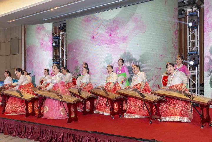 老年協(xié)會濱海新區(qū)分會的會員代表們表演伽倻琴彈唱《桔梗謠》。