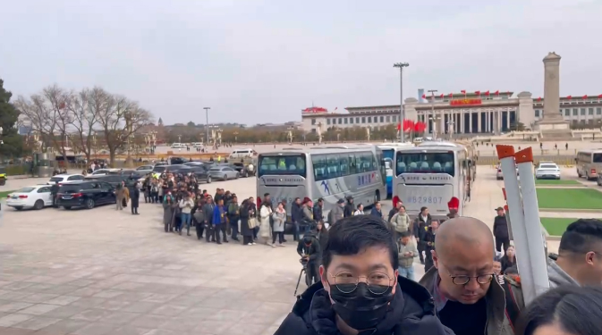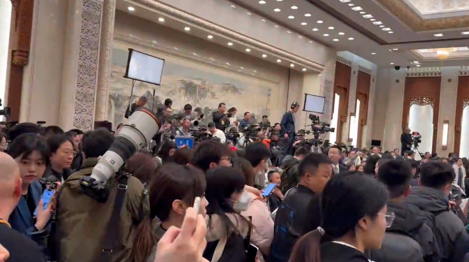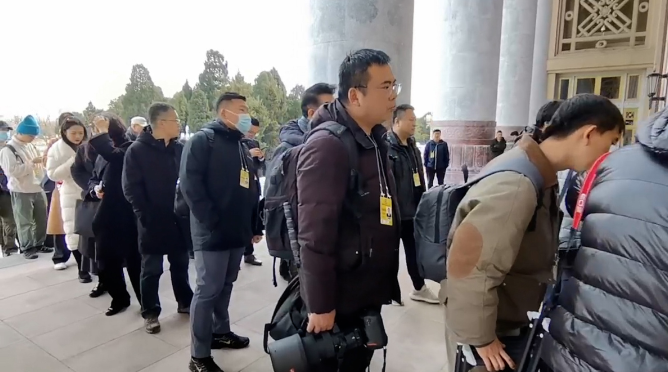 今日北京的下午雖有陽光,但空氣中仍有寒意,離入場還有大半個鐘,大會堂外的路邊,已經(jīng)有多位記者排成一條長龍,從閘口一直延伸到遠處。有人背負沉重的攝影器材,有人拖裝滿設(shè)備的行李箱,還有人不斷整理自己的西裝,他們的目標只有一個——快速衝入人民大會堂,霸佔絕佳採訪位置。