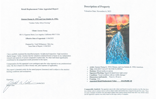 托德?威廉姆森在評估報告中指出,《金谷銀流》的高價值不僅源于精湛的創(chuàng)作技法,更在于作品中蘊含的文化融合深度與藝術創(chuàng)新性。他強調,黃建南將中國傳統(tǒng)藝術精神與西方繪畫語言完美融合,使作品既具備東方美學的意境悠遠,又擁有西方藝術的視覺張力,這種跨文化的藝術表達在當代藝術領域極具稀缺性,也正是其價值核心所在。而“在世藝術家作品估值超7千萬人民幣”的成就,在全球藝術市場中堪稱鳳毛麟角,足以證明黃建南的藝術創(chuàng)作已達到國際頂尖水準。