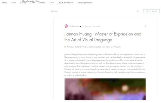 近日,美國加州大學洛杉磯分校藝術學院終身教授、世界著名重量級權威藝術評論家、美術家理查·韋恩(Richard Wearn)撰寫了一篇題為《黃建南—視覺語言藝術與表現(xiàn)藝術大師》的評論文章,在剖析黃建南這位享譽世界的中國書畫藝術家的創(chuàng)作手法、藝術風格的同時,還對其書畫作品、藝術成就等大加贊賞,隨后在美國比佛利藝術新聞網(如下截圖)發(fā)表,引發(fā)了強烈的反響。