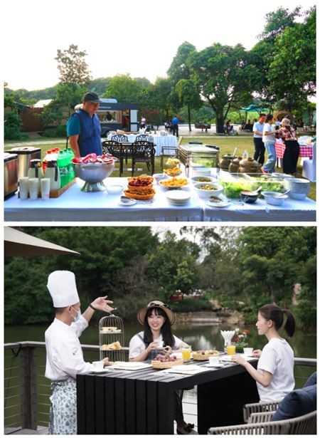 湖畔烤吧:由14個林間燒烤爐組成,可以進行森林中的戶外燒烤、同學聚會等系列團建活動。湖內(nèi)養(yǎng)有草魚、羅非等魚類,客人可以享受垂釣的樂趣。對面就是幸福共享中心,可以舉辦餐飲、會務、私人PATY等活動。