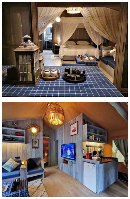 云林帳篷:在整個度假區(qū)內(nèi)共有6棟,專為休閑度假和養(yǎng)生而打造,追求自然與原生態(tài)雙結(jié)合??头繛閮煞恳粡d一陽臺,房間分為大床房與兒童房。配套有空調(diào)、電視、地暖、溫泉浴缸等設施;浴缸有雙人模式并自帶按摩功能,為您帶來最舒適的體驗。拉開窗簾,走出陽臺,便可擁山色湖光入懷,深呼吸一口,負離子簇擁而來的體驗仿佛就能讓您忘卻煩惱,重拾自己內(nèi)心最真實的感受。
