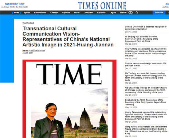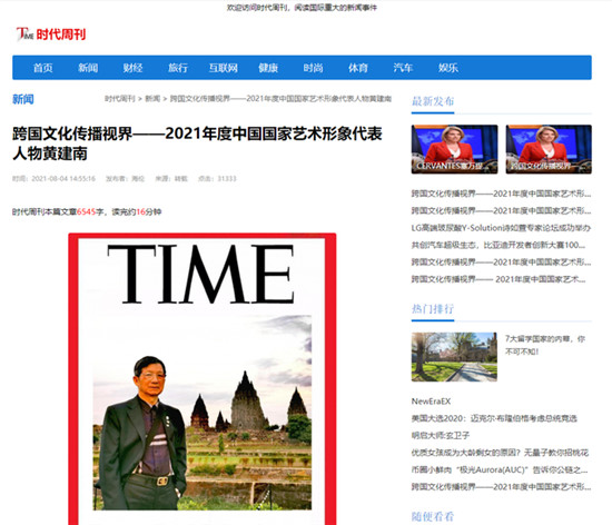 這一期的《時(shí)代周刊》發(fā)行了中英文雙語版,以《跨國文化傳播視界——2021年度中國國家藝術(shù)形象代表人物黃建南》為題,大篇幅報(bào)道黃建南。該專題不僅介紹了黃建南的成長歷程、藝術(shù)之路,還展示了黃建南的20多幅作品。