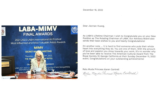 ▲凱倫·坎特雷爾公主擔(dān)綱本次頒獎(jiǎng)典禮的主持,右圖為她寫給黃建南的賀信。