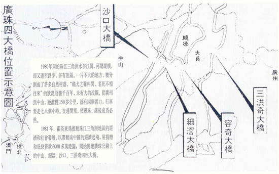 珠江由東江、西江、北江匯合而成,其中西江流量最大。如果以珠江干流虎門水道劃分東西兩部分,西面河流縱橫,土地肥沃,為沖積平原,有八大出海水道,俗稱八大門,珠三角的歷史是自西向東發(fā)展的。按習(xí)慣的講法,珠三角核心地區(qū)(或稱小三角)是指北到廣州,東到深圳,西到珠海、江門的一個(gè)區(qū)域。在珠三角地區(qū),改革開放前,公路交通是非常落后的。在東面,有從廣州到深圳的107國(guó)道,但道路狹窄,在西面,有自廣州經(jīng)佛山、順德、中山、珠海的105國(guó)道,中途要經(jīng)幾個(gè)渡口,番禺境內(nèi),基本沒有公路網(wǎng)絡(luò)。番禺的南沙更是偏僻的漁村,當(dāng)時(shí)又是邊防地區(qū),外地人進(jìn)入均需持印著十只手指指紋特征的邊防區(qū)證。