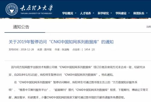 太原理工大學(xué)通知,自2019年1月1日起,該校師生暫停訪問(wèn) “CNKI中國(guó)知網(wǎng)系列數(shù)據(jù)庫(kù)”