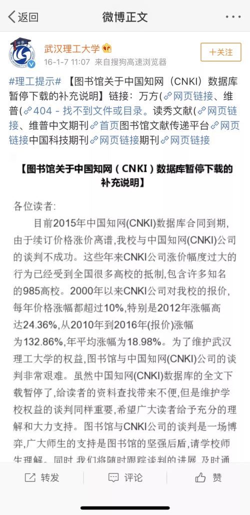 2016年1月,武漢理工大學(xué)的師生接到了知網(wǎng)停用的通知。隨后武漢理工大學(xué)在微博發(fā)布說(shuō)明稱(chēng),“目前2015年中國(guó)知網(wǎng)(CNKI)數(shù)據(jù)庫(kù)合同到期,由于續(xù)訂價(jià)格漲價(jià)離譜,我校與中國(guó)知網(wǎng)(CNKI)公司的談判不成功。”