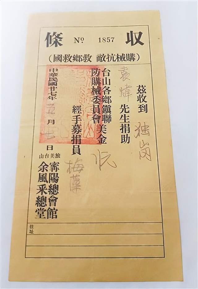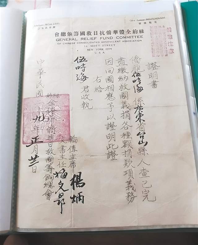 ??????? 據(jù)統(tǒng)計(jì),李春榮累計(jì)捐贈(zèng)史料達(dá)214件(份),其中不乏極具歷史價(jià)值的華僑捐款憑證,包括《紐約全體華僑抗日救國(guó)籌餉總會(huì)證明書(shū)》《華僑拒日救國(guó)后援總會(huì)捐款收條》《旅美臺(tái)山寧陽(yáng)總會(huì)館、余風(fēng)采總堂抗敵救鄉(xiāng)救國(guó)捐款收條》《墨西哥尾利打抗日救國(guó)后援會(huì)捐款收條》等。